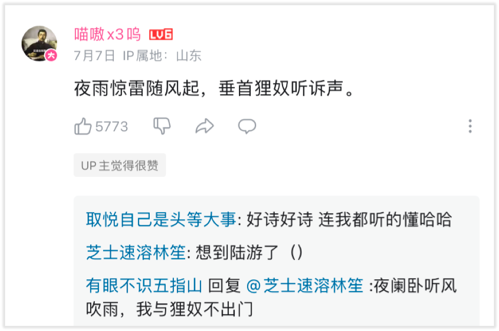 网友则写道——“夜雨惊雷随风起,垂首狸奴听诉声”。