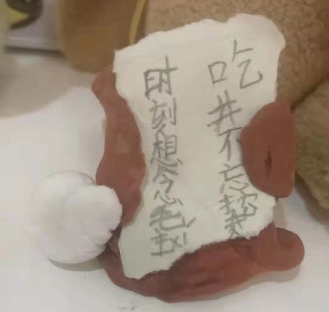 结果,有次我出差回来,看到儿子做了一个手工泥娃娃,上面写着“吃水不忘挖井人,感谢领袖毛主席”。