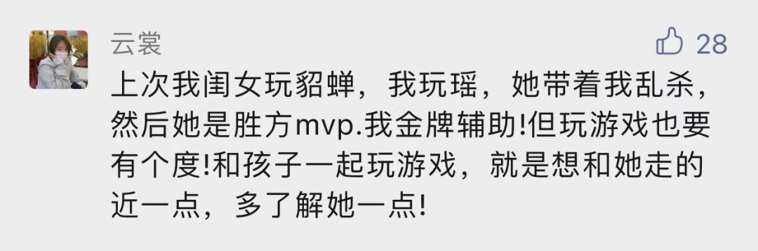 尽管我和她爸爸都玩游戏,但我女儿在游戏上还是会受同学影响多一些,比如我都不知道游戏出新皮肤了什么的,他们在课间休息也会偶尔讨论到,所以我就会主动和女儿聊,这样才有共同话题,她才愿意跟我讲学校里其他的事情。