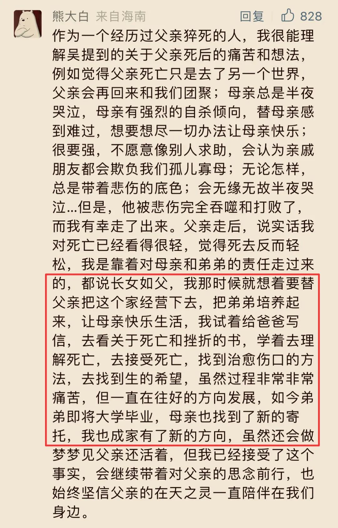 父亲去世后,身为孩子的她,也曾像吴谢宇一样,拼命想将母亲从悲伤中拉出来,想方设法想让母亲快乐。