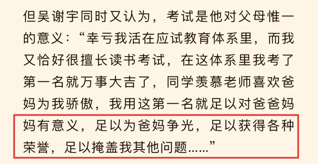 所幸的是,吴谢宇很有学习天赋,成绩一直很好,这在一定程度上抚慰了父母的绝望与焦虑,令父母感到骄傲与自豪。