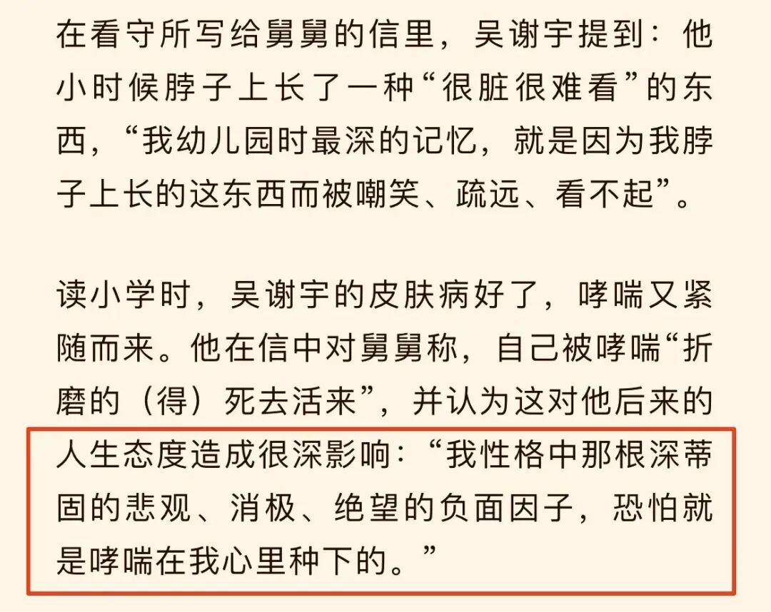 在这样一种充满着恐惧、焦虑、悲观、无力的家庭氛围的包裹下,吴谢宇在成长中感受到的同样是: