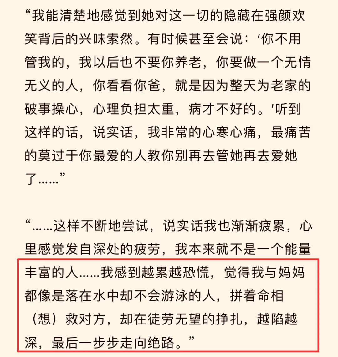 我感到越累越恐慌,觉得我与妈妈都像是落在水中却不会游泳的人,拼着命相(想)救对方,却在徒劳无望的挣扎,越陷越深,最后一步步走向绝路。