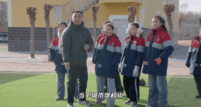 在教室里,阿云嘎和孩子们分享了自己的故事。他在一个牧民家庭里长大,从小就开始帮家里放羊,因为喜欢跳舞,在不断努力练习后,获得了去北京学习音乐剧,如今已经是国内最著名的音乐剧演员之一了。