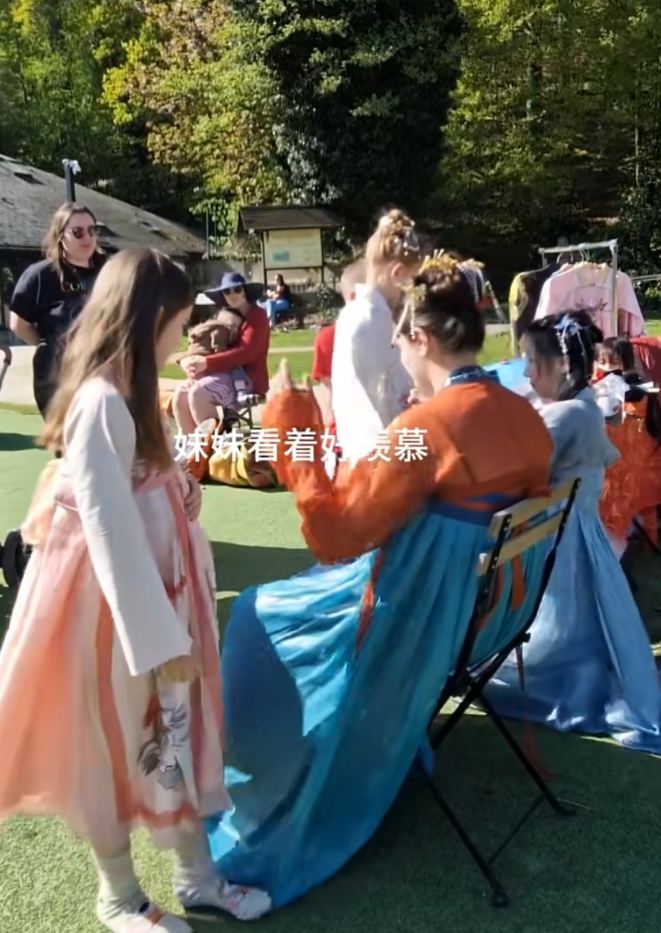 博主@娜娜小憨憨的兴趣爱好是汉服,所以她便在比利时街头摆了一个小服装摊,专门邀请家长和孩子前来体验汉服妆造——在她的视频里,前来体验的人络绎不绝。