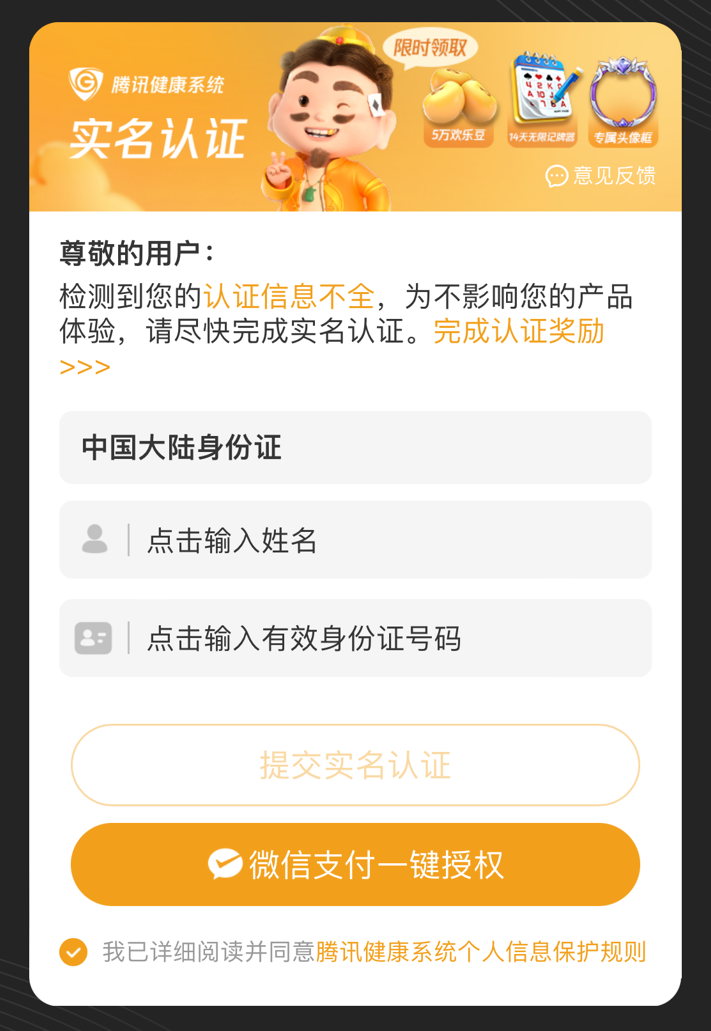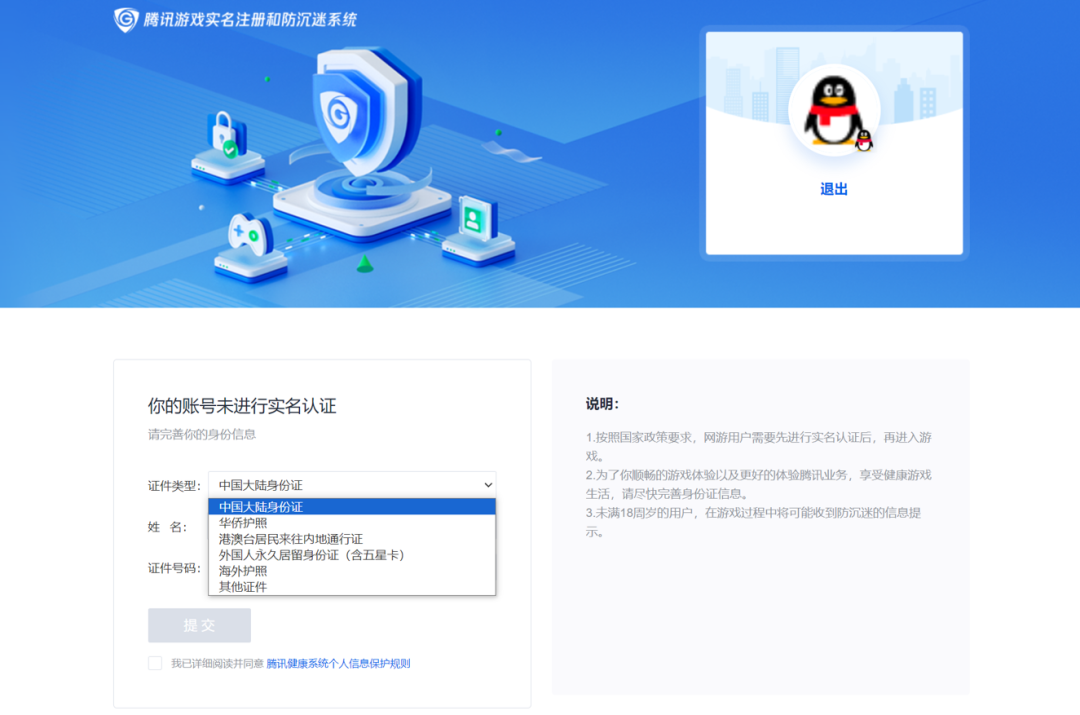 PC端支持各类型证件在腾讯游戏健康系统官网、WeGame、QQ游戏大厅和健康系统小程序等的实名认证。