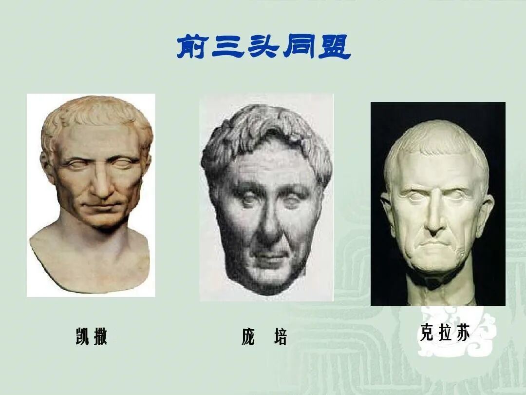 之后是凯撒、庞培、克拉苏组成的前三头联盟。凯撒发动了高卢战争,占领了高卢全境,为自己赢得威望,也培育了忠于自己的军队。克拉苏想效仿凯撒,他的目标是帕提亚(安息),但是却战死在那里。接着,庞培和凯撒爆发内战,庞培战败,逃到埃及却被埃及人刺杀。凯撒让埃及成为罗马的附庸,并清除庞培余党。这样,凯撒成为罗马的独裁官,但他又在元老院被刺杀。