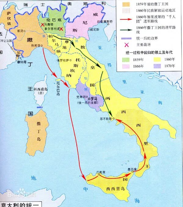 原属于神圣罗马帝国一部分的萨伏依王室,越过阿尔卑斯山,在皮埃蒙特的都灵建都。然后通过联姻,萨伏依王国和撒丁王国合并,原萨伏依王室成为撒丁王国王室。在马志尼和加里波第等人的推动下,撒丁王国开展了意大利的统一运动,并获得成功,建立意大利王国。