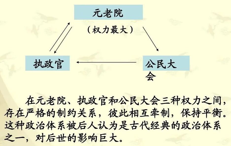 罗马的政体传承比罗马法律更为广泛。罗马的政体吸收了古希腊的民主政治,形成元老院、执政官、公民大会的体系,三种权力存在严格的制约关系,保持着平衡。这是三权分立思想的源泉。