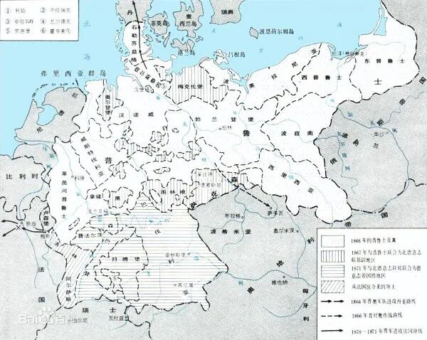 然后,俾斯麦用外交手段,让法国、英国保持中立,与意大利搞好关系。这样,普鲁士就放心大胆地对付奥地利。普鲁士赢得了普奥战争,奥地利失去了德意志老大的地位和从丹麦刚获得的土地,普鲁士成为新的老大。奥地利只好和马扎尔人为主体民族的匈牙利联合,成立奥匈帝国,领土还包括波西米亚、西里西亚、罗马尼亚大部分和巴尔干半岛西北部分地区。