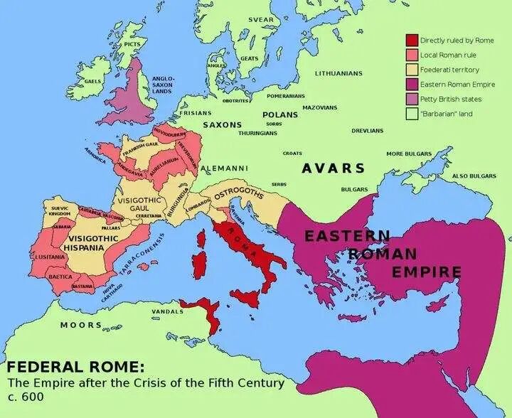 罗马帝国衰落,作为蛮族的日耳曼人开始向罗马入侵。日耳曼人有很多部落,汪达尔人攻克罗马城后最后迁徙到北非地区;西哥特人灭了西罗马帝国,然后在伊比利亚半岛建立西哥特王国;东哥特人进入亚平宁半岛建立东哥特王国;苏维汇人到了伊比利亚半岛的西北端;伦巴第人越过阿尔卑斯山来到波河平原;阿勒曼尼人来到阿尔卑斯山北麓;法兰克人和勃艮第人进入高卢;盎格鲁人和萨克森人越过海洋,占领大不列颠岛。