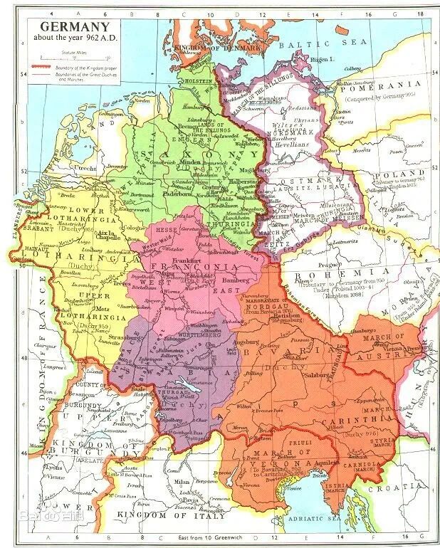 上一篇介绍法国的文章介绍过,根据法兰克人的传统,他们的遗产是要在所有儿子之间分家继承的。这样,查理曼帝国一分为三。其中,东法兰克王国就是我们这篇文章关注的地区。
