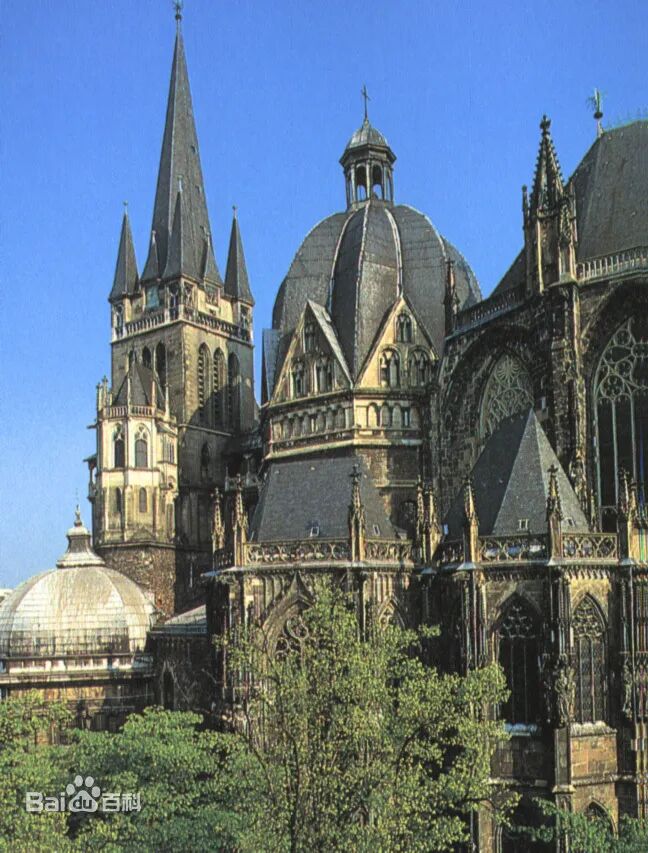 法兰克人在亚琛修建了大教堂,查理曼大帝长眠于此。我们的史学家把拥有“奥古斯都·凯撒”称号的西方君主翻译成皇帝,没有这个称号的西方君主一般翻译成国王。查理曼大帝是西罗马帝国灭亡后,欧洲西部第一位皇帝。以后新的皇帝一般都会在亚琛大教堂加冕。