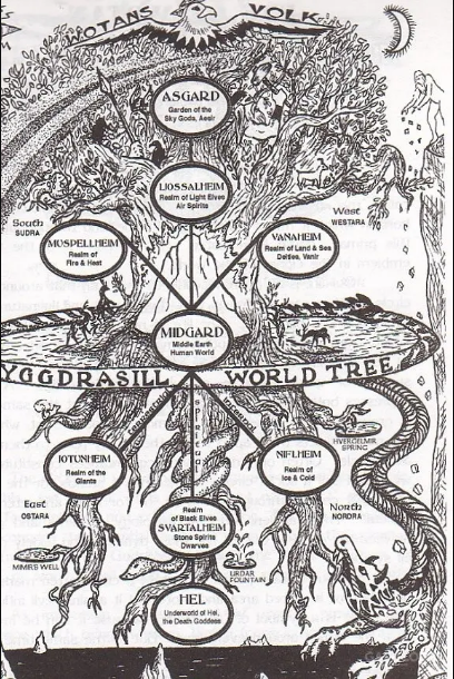 北欧神话的世界观也与众不同。奥丁三兄弟杀死了巨人始祖尤弥尔,用尤弥尔尸体创造了万物,从尤弥尔心脏里长出了世界之树。世界之树连接了九个世界,最高的是阿萨神族居住的阿斯加德,接着是精灵国度亚尔夫海姆和华纳神族居住的华纳海姆;中间的是人类世界米德尔加德(又翻译成“中庭”),阿斯加德和米德尔加德之间有比弗罗斯特彩虹桥相连,而米德尔加德和巨人国度约顿海姆之间只隔着铁森林。侏儒国度施瓦塔尔夫海姆也在中间这层。在世界之树树根之处的是雾之境尼福尔海姆和火之境穆斯贝尔海姆,尼福尔海姆和穆斯贝尔海姆之间隔着金加仑鸿沟,最下面的是冥界赫尔海姆。