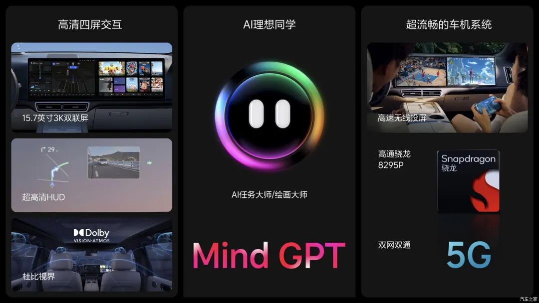 内饰方面,与理想L7完全相同,采用四屏布局,包括方向盘上的可触摸显示屏、高清HUD、中控屏与副驾屏,其中中控屏与副驾屏为15.7英寸的3K屏,内核标配高通骁龙8295P芯片,提供5G网络,音响系统配备杜比视界和杜比全景声,Max版本标配理想MEGA同款铂金音响,与奔驰柏林之声同款PSS扬声器,并拥有19个扬声器。新车还拥有大模型Mind GPT能力的语音助手理想同学,甚至可以是陪伴儿童成长的老师。新车方向盘标配加热功能,采用Nappa真皮材质。
