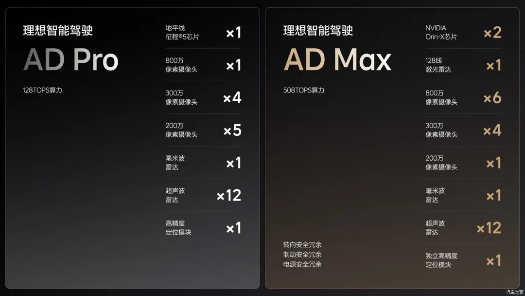 智能驾驶方面,Pro车型标配智驾AD Pro,拥有10个摄像头+1个毫米波雷达,采用地平线征程5智驾芯片,算力128TOPS,可以实现高速NOA(变道超车/出入匝道)、自动泊车、离车泊入;Max车型标配智驾AD Max,拥有11个摄像头+1颗激光雷达+1个毫米波雷达,标配双英伟达Orin-X芯片,算力508TOPS,可以实现高速NOA、无高精地图城市NOA(路口通行、施工避让、城市拥堵场景)、自动泊车、离车泊入、代客泊车(路线学习、跨多层通道形式)等。AEB自动紧急制动可实现最高120km/h刹停,夜晚实现最高80km/h刹停。