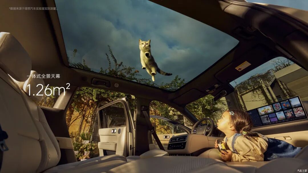 与L7不同的是,此次理想L6还配备了1.26平方米的全景天幕,不再是分体式的天窗,并提供电动遮阳帘,但取消了L7上的后排的显示屏。新车天幕玻璃和前后门玻璃的紫外线隔绝率超过99.8%。车窗和天幕配备双层夹胶玻璃。