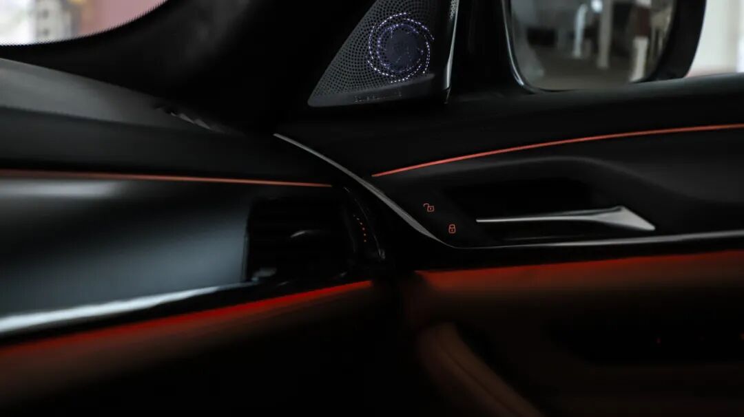 再比如这两张机甲风的一体式座椅,看似战斗,实则填充物厚实,承托性出色,上半部分可单独调节侧翼夹紧或放开,以适应不同身材的老板们,头枕处带有可发光的标识,明明白白的告诉你:146.89万的宝马5系,钱都花哪儿了!