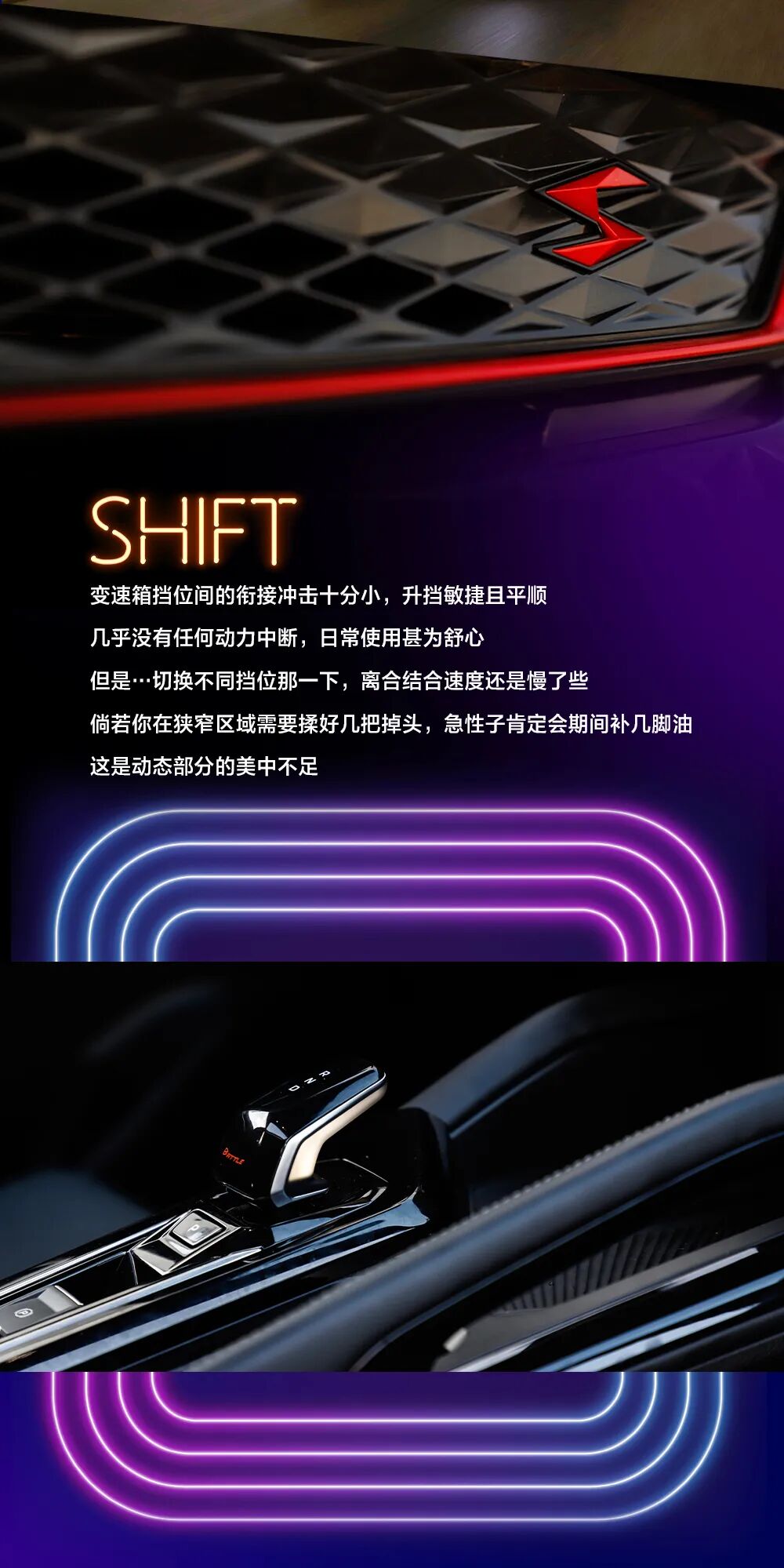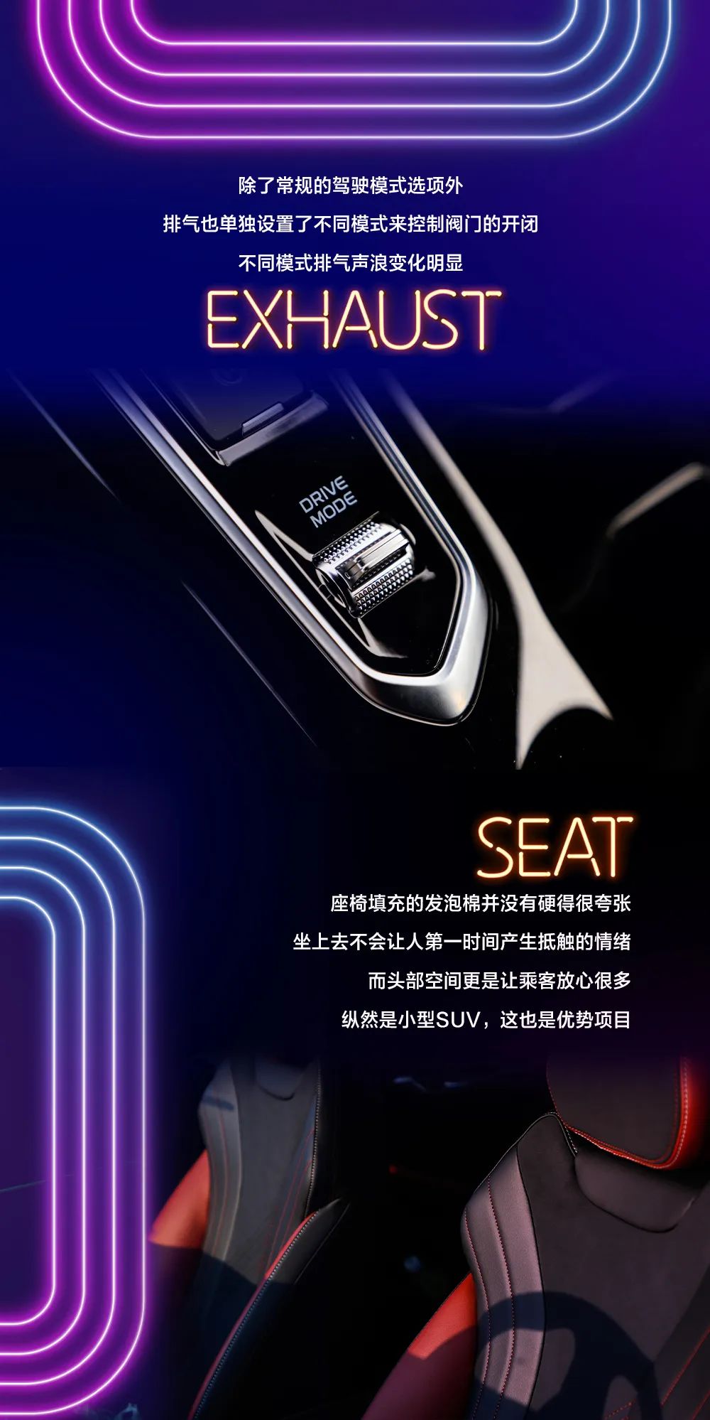 根据配置不同提供手机无线充电舱(支持Qi充电协议、多人共享、异物监测等功能,最高充电功率达15W)、流光溢彩律动氛围灯(具备开门迎宾和呼吸模式,可随驾驶模式、车速和音乐律动)、三辐式多功能皮质方向盘(集成蓝牙、曲目快进、声音加减、自适应巡航等功能)、全新样式电子档把(带有Battle标识)、后排出风口(全系标配)等。