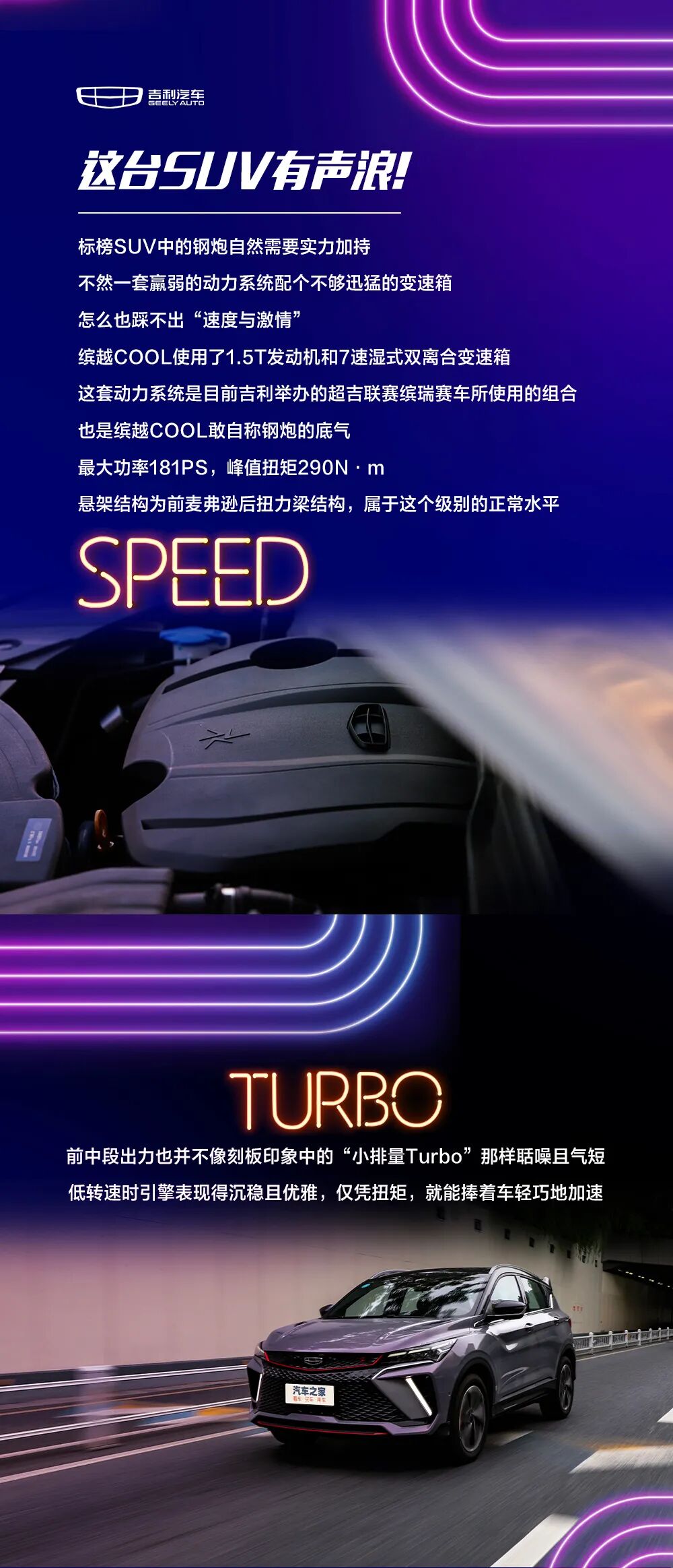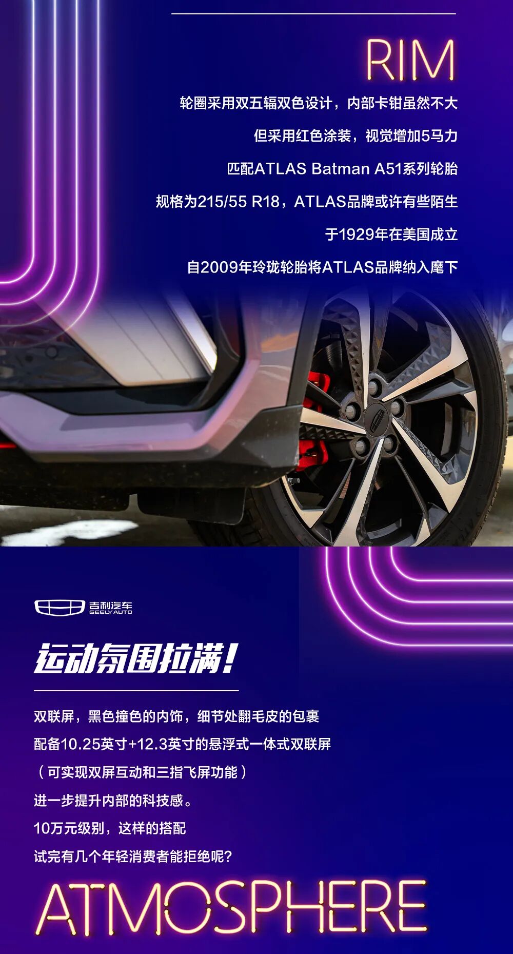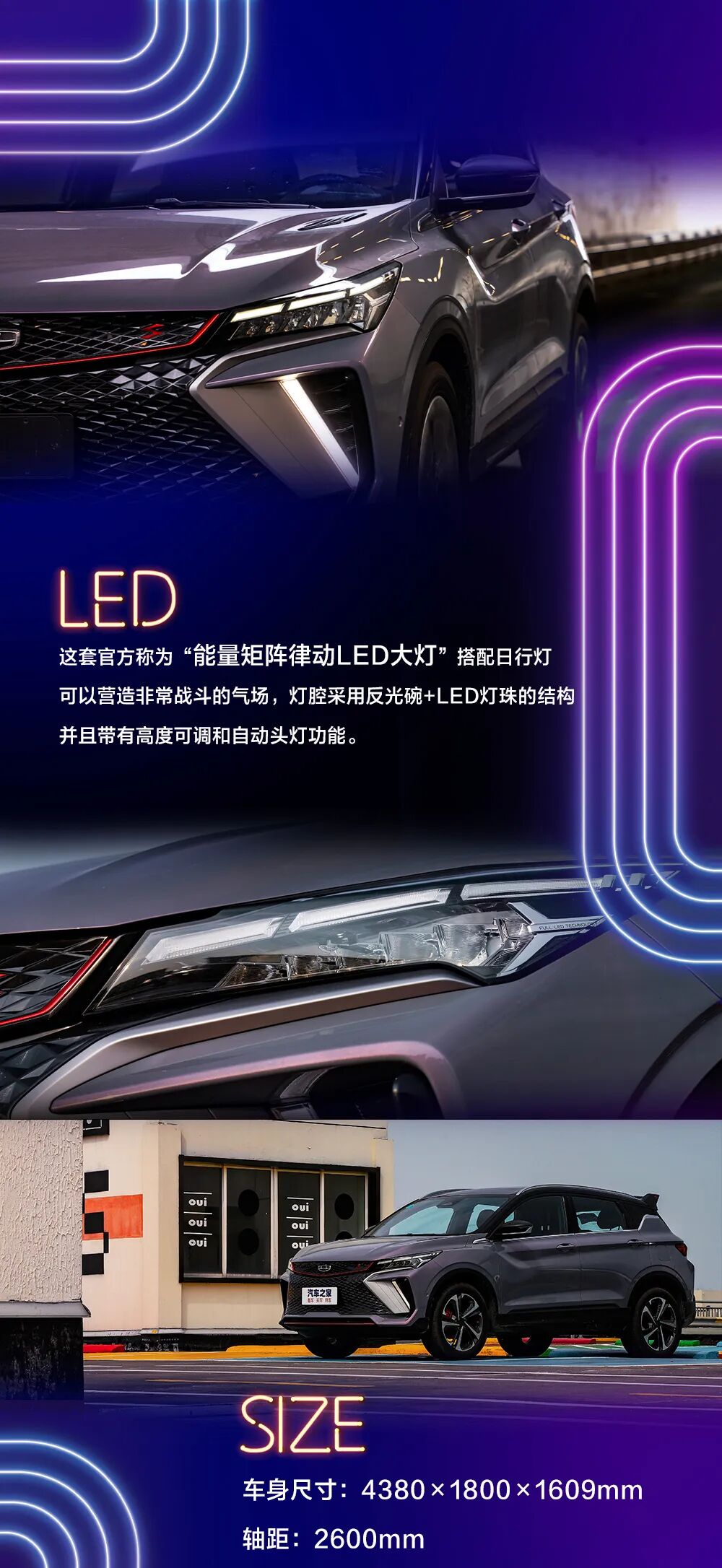 动力方面,新车搭载吉利1.5TD发动机(四缸),其最大功率为133千瓦(181马力),峰值扭矩为290牛·米。传动方面,与之匹配的是全新一代7速湿式双离合变速箱。