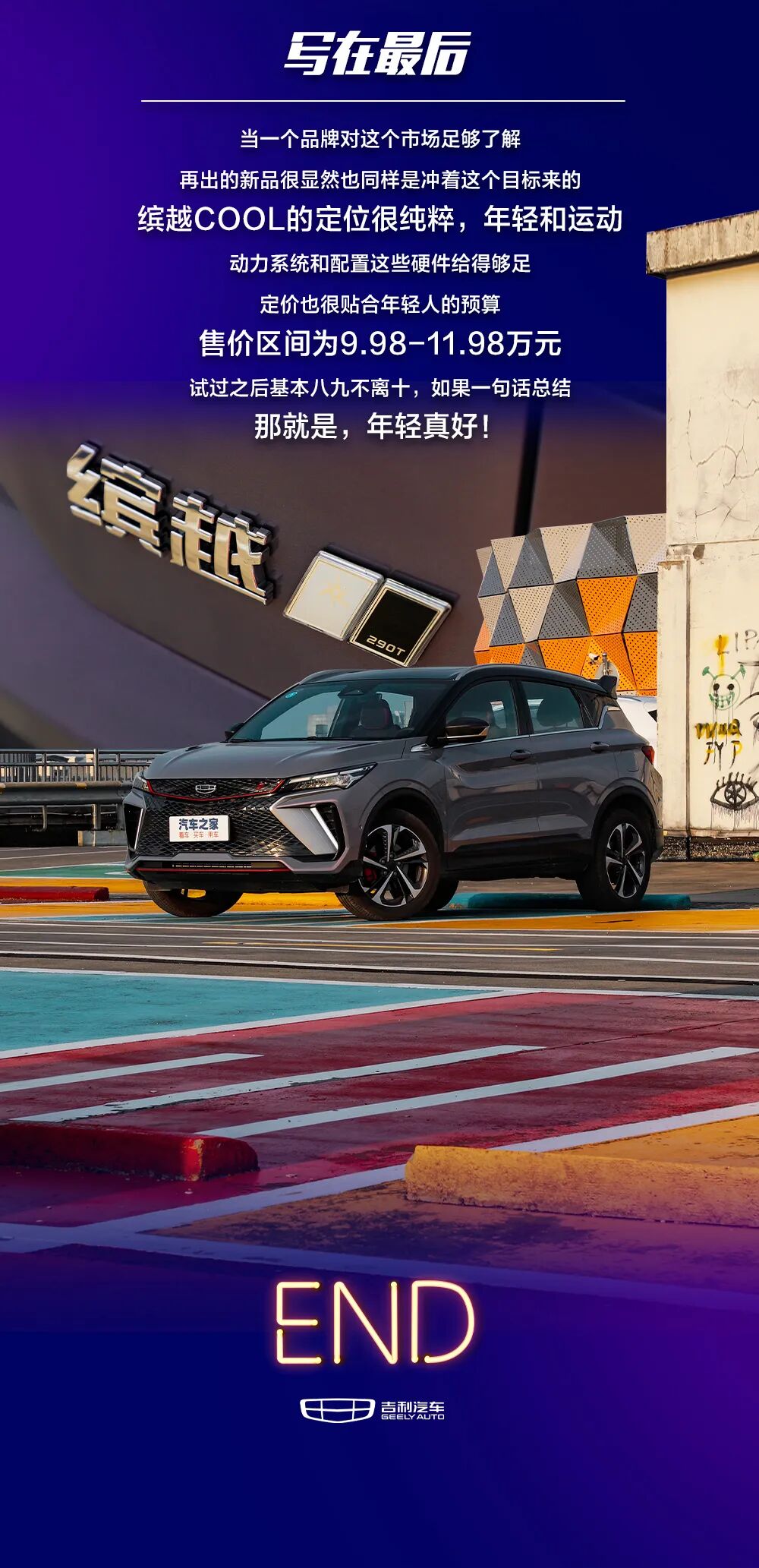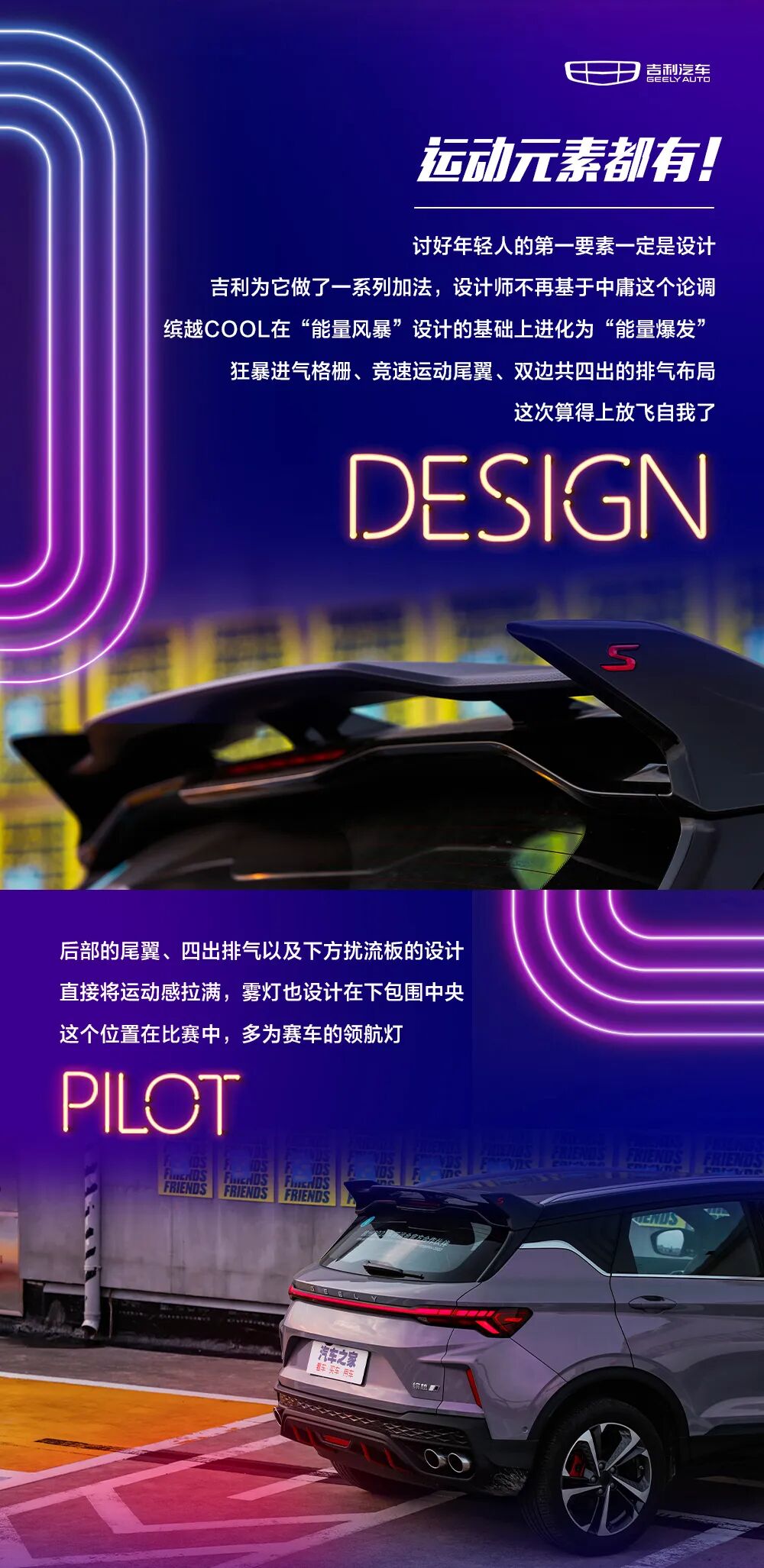 缤越COOL可以视为缤越的中期改款车型,前脸换装了全新的“狂暴进气格栅”,虽然延用上下分体的设计,但尺寸更大,视觉效果也更加夸张。另外,全新设计的大灯以及雾灯区域搭配红色饰条,使前脸看上去十分运动。新车整体轮廓变化不大,除了采用双色车身外,新车还配备全新造型的18英寸轮圈,内部刹车卡钳也采用红色涂装。另外,其还在反光镜外壳采用仿碳纤维装饰,小细节很用心。