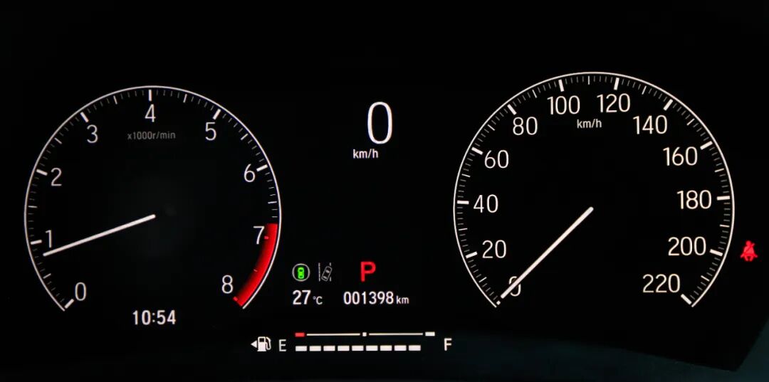 新一代本田的内饰风格并不陌生,用料上有所升级,说人话就是软质包裹的地方更多了。仪表盘采用半液晶屏幕,右侧为机械式时速表,左侧液晶屏幕,可以显示转速、油耗、导航、驾驶辅助系统等相关信息。配色和UI设计的很舒服,简洁易读。