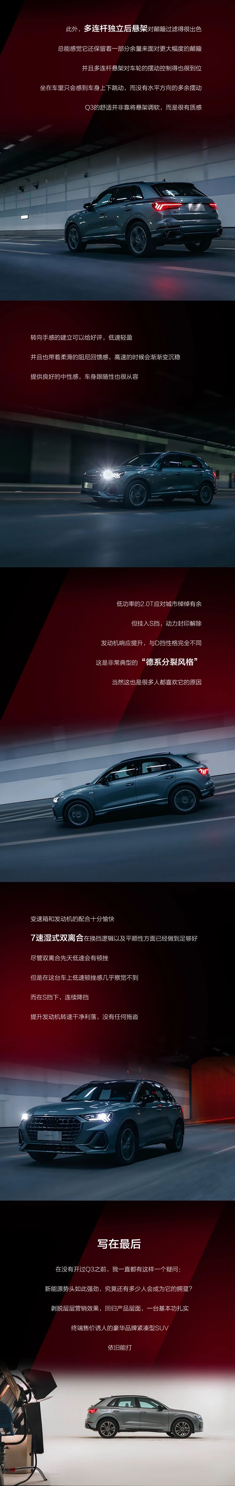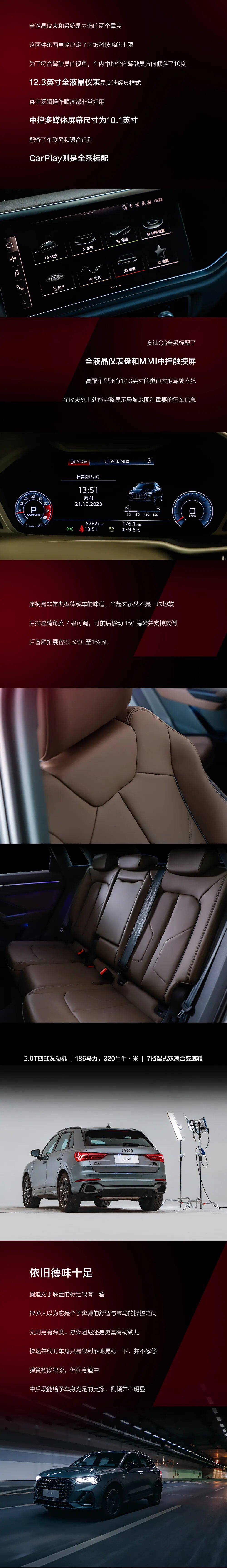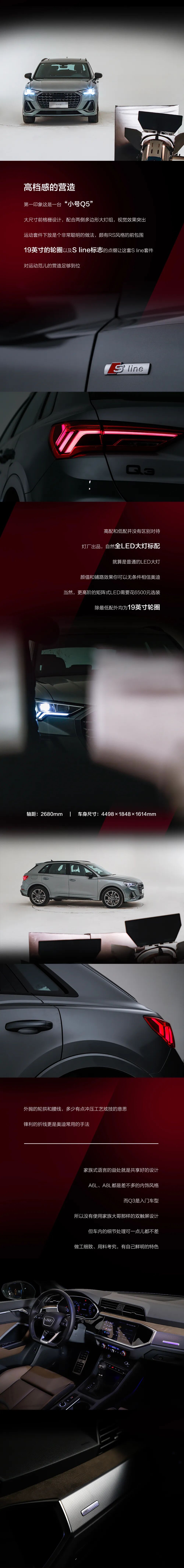新款奥迪Q3正式上市,售价区间为27.98-33.59万元。新车针对外观进行了全新的升级,包括前格栅、前保险杠以及前扰流板等处均进行了调整优化,使新车前脸看上去更加精致。此外,新车还将提供19英寸轮圈,并增加了阿瓦隆绿和量子灰两种车身颜色,后续还将会推出哑光车色。