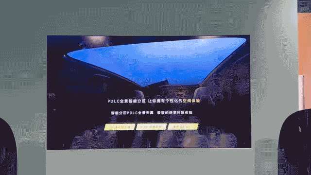 尺寸达2.1㎡的PDLC全智能分区天幕具备10块可控区域,切换时间仅为0.3s。从官方提供的效果图来看,其分区控制方式十分炫酷。