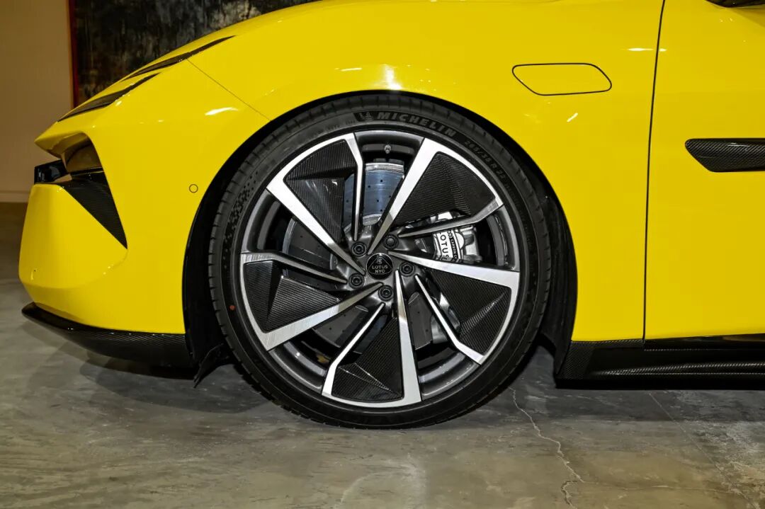 10活塞碳陶瓷复合制动系统被低风阻轮圈遮的严严实实,着实可惜。在其加持下,新车的100-0km/h制动距离小于33米,同时可以提供更轻的簧下质量,并提升抗热衰减能力。此外,CDC减振器、主动空气悬挂与主动后轮转向均未缺席,并加入了路特斯智能防侧倾控制系统。