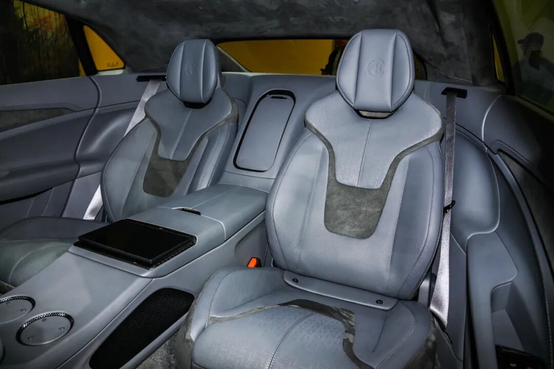 实拍车辆采用2+2的四座布局,打孔+翻毛皮材质的座椅兼顾运动造型与舒适性,后排两张独立座椅搭配宽大的中央岛台,并且配备有独立的触控屏。