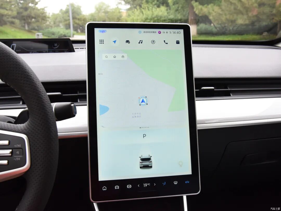 内饰还是熟悉的配方,也是时下主流的设计,取消物理按键,只留一块或多块屏幕,整个车内相当简洁。哪吒AYA主要对木纹饰板的配色进行了优化,车机系统也有升级,使用MT8675芯片,速度更快,并增加车载K歌、无线投屏功能。