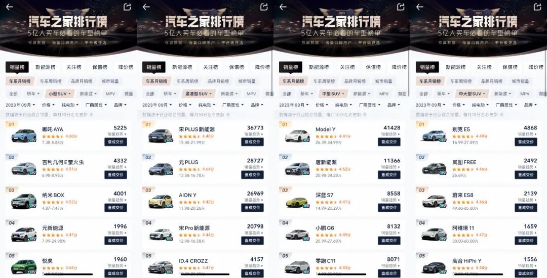按照级别来看,小型SUV销冠为哪吒AYA,月销5225台,相比第二名的吉利几何E萤火虫高出近900台;紧凑型SUV和中型SUV领域都是老面孔了,比亚迪宋PLUS新能源、特斯拉Model Y,领先第二名一大截,并且二者都是网上没赢过线下没输过的选手,需要注意的是,造车新势力的相关产品都没有进入前三;来到中大型SUV榜单,传统车企出身的别克E5竟然夺冠了,相比第二名的销量近乎翻倍。大型SUV销量排名为何没有出现在上图?因为仅有红旗E-HS9一款,其9月销量为281台。