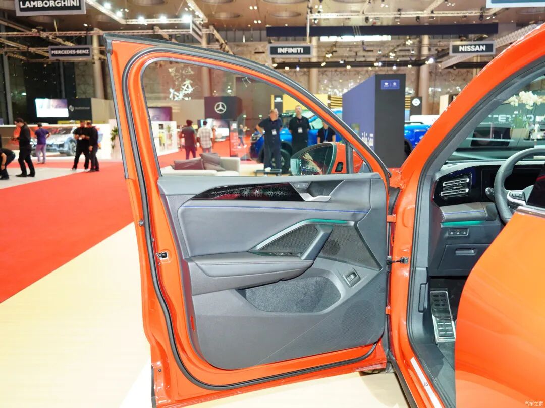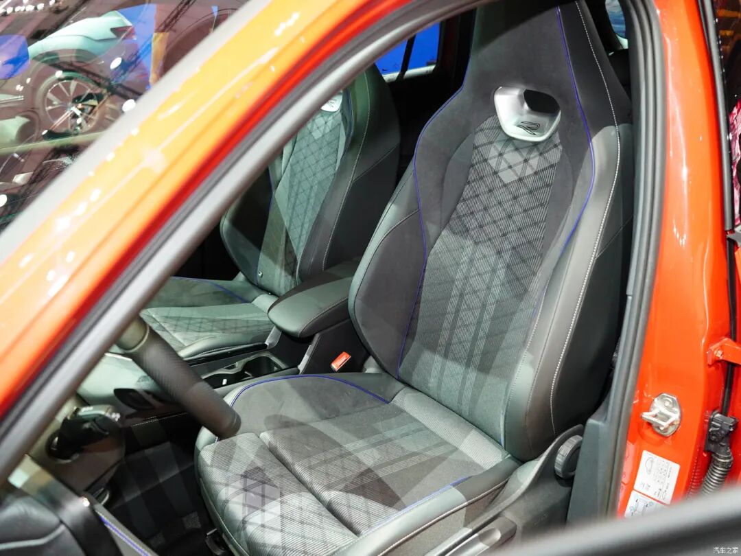 实拍车型前排配备了一体式座椅,辅以菱形饰纹与蓝色饰条,前者对高级感的提升有帮助,蓝色饰条就不必多说了,代表大众的高性能。