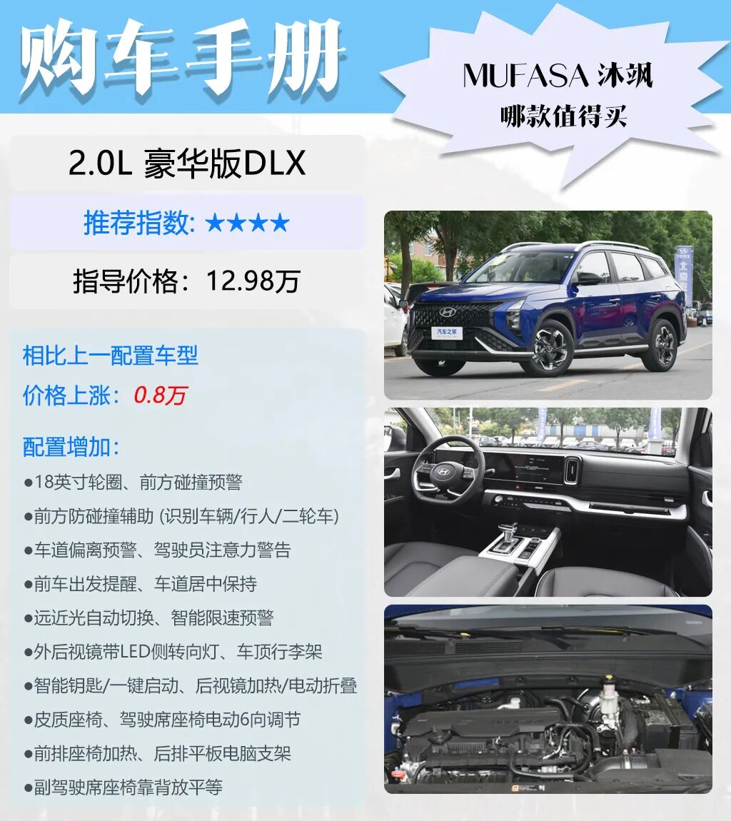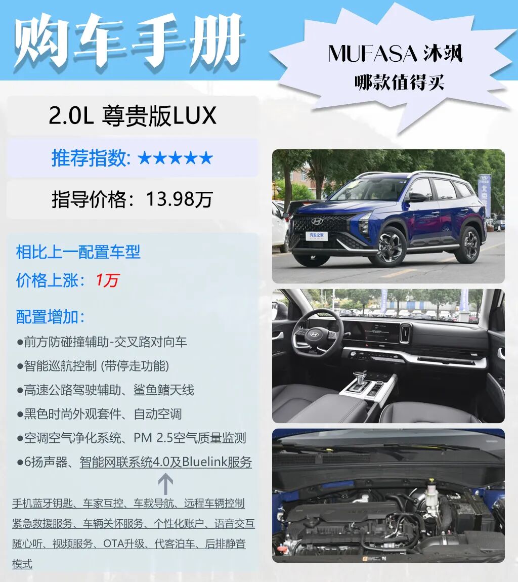 在上一配置车型的基础上,预算再提升1万元就能够得到更运动时尚的外观,更完善的驾驶辅助系统以及更强大的车机系统,而且这些增加的配置都是比较实用的,如果预算充足直接选这款2.0L尊贵版LUX就好。