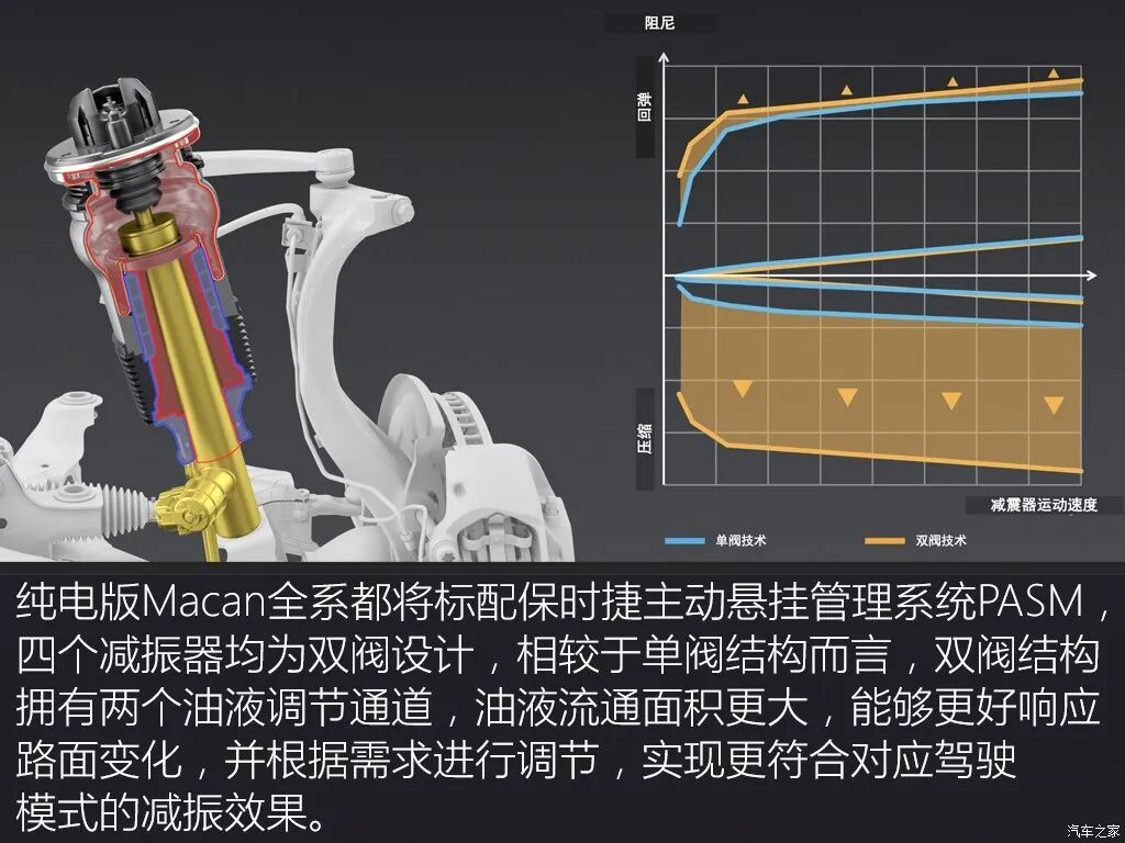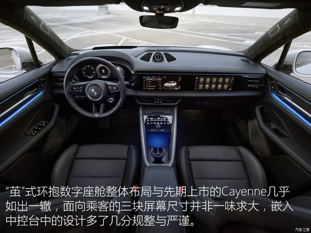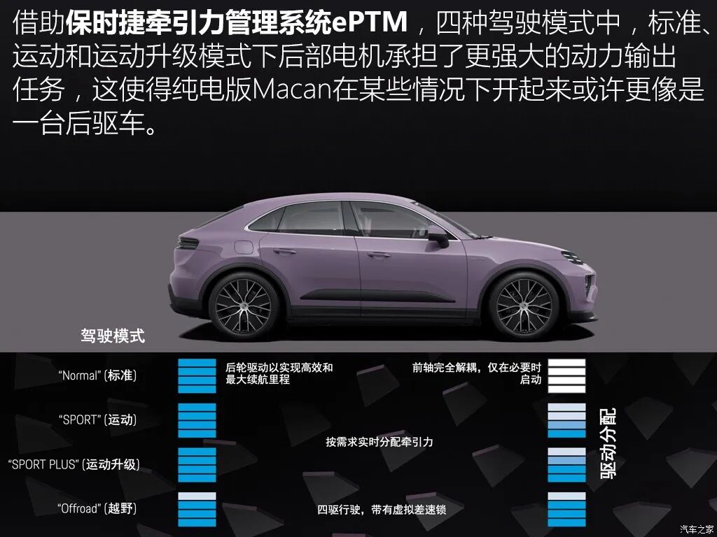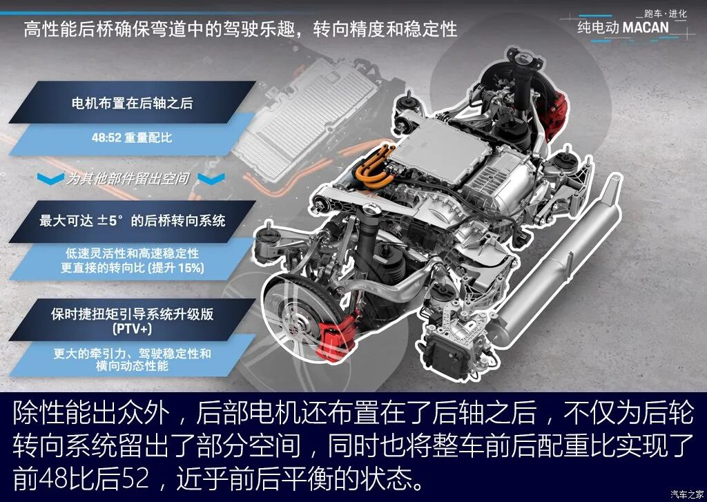 前后双电机是标配,其中碳化硅电动的后置电机是重点,首先后置电机位置就如同911一样确实放在了后轴之后,即便如此它的前后重量配比是48比52,基本上还是能做到前后平衡的。悬架结构方面,高配车型将搭载双阀空气。减震系统,软硬高低可调,不仅兼顾舒适与运动,更能在运动操控和轻度越野之间相辅相成,结合空气悬架系统和保时捷扭矩引导系统升级版。纯电版Macan驱动力分配速度比传统四驱系统。更快。响应时间在十毫秒以内。