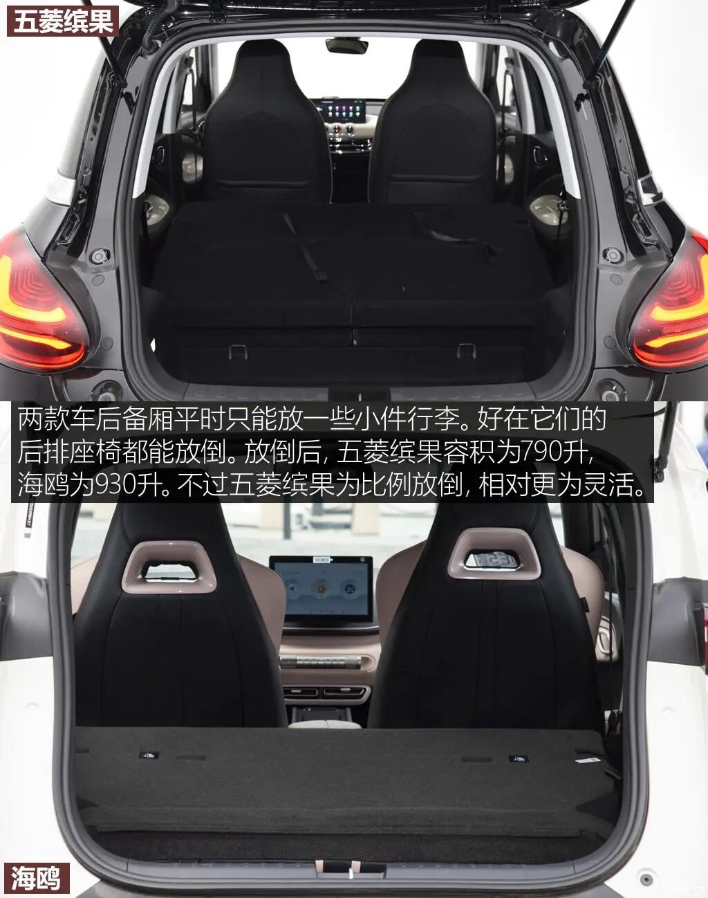 在外观这一轮的比拼中,颜值如何姑且不谈,因人而异即可。不过在尺寸上缤果有着绝对的优势,海鸥则胜在配置,两车各有所长,但对于这类小型车而言,似乎尺寸更被用户在意。