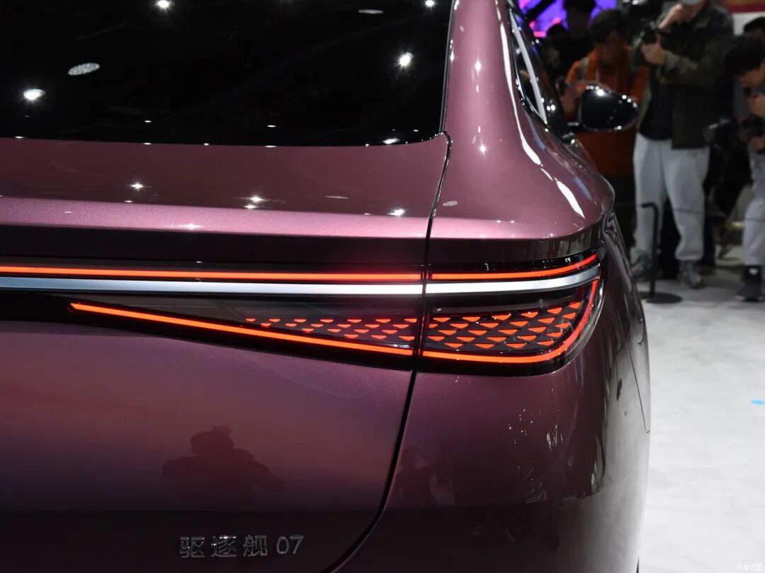 来到车尾部分,前低后高俯冲的态势尤为明显,同时后段腰线向后延伸与“小鸭尾”融为一体,如此设计够新颖。贯穿式尾灯造型类似船桨,内部光源为点阵式布局,细节质感出色,视觉效果也够科幻。