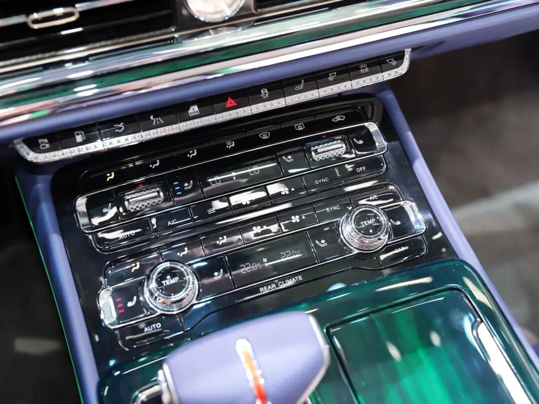 大量的物理按键主要集中在挡把前方的区域,包含空调系统、座椅通风加热及车内照明等控制按键。挡把后方的区域则主要为多媒体系统的控制区。