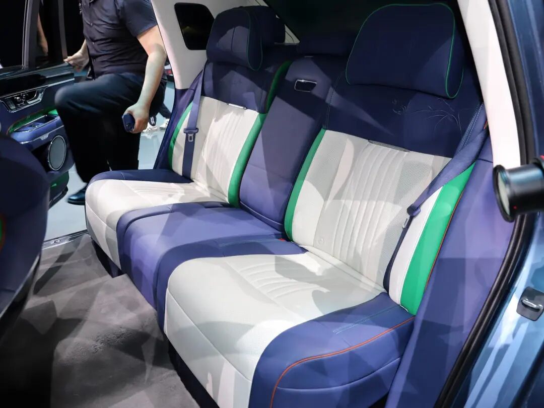 宽大舒适的座椅采用蓝白双色搭配,并加入了绿色元素。后排座椅进行了重新优化,可以调整座椅的靠背和前后角度,中央配有宽大的扶手,可以控制车辆的空调和多媒体系统。