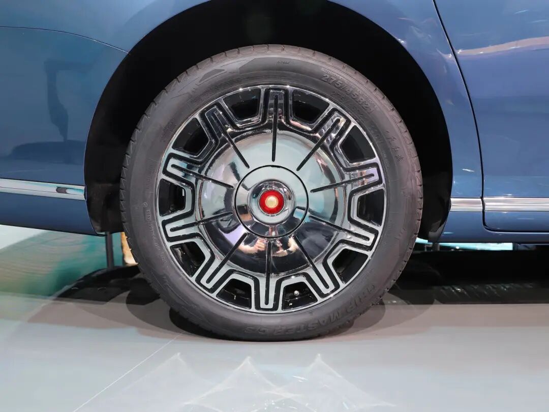 车身侧面在维持车型轮廓的同时,车身长度进一步加长。展车采用了规格为275/45 R21的玲珑GRIP MASTER国宾车系列轮胎,轮圈样式也更加华贵高雅。
