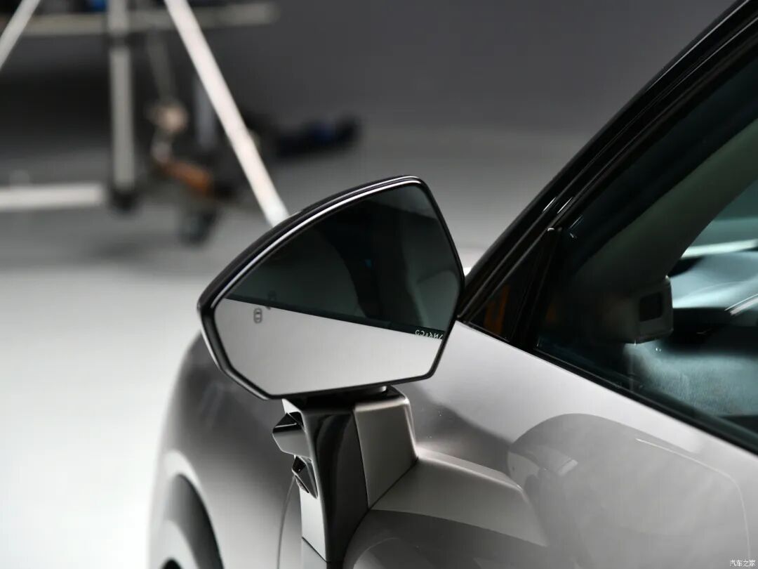 后视镜整体造型别具一格,酷似涉水喉,下方柱体集成了全景影像以及驾驶辅助的摄像头,同时带有可亮化的品牌Logo。重点是,该后视镜采用了无边框设计,与极星Polestar 2、极氪X同款,能最大限度拓展镜面面积,使驾驶员获得更大的视野范围。
