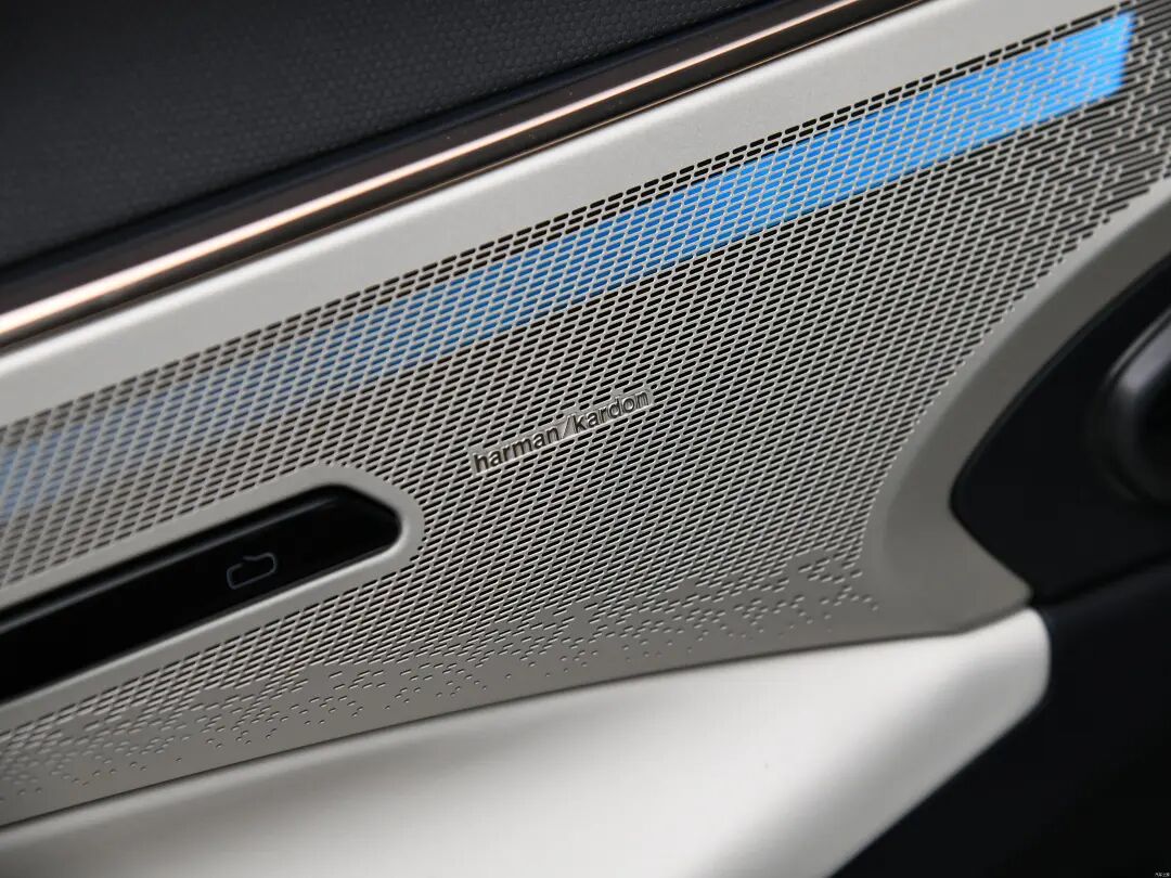 车门上饰板的设计很讨巧,也是内饰繁复的代表,该位置实现了隐藏式门把手、电子门锁以及光晕式氛围灯和音响罩的一体式效果,实拍车型还装配了哈曼卡顿品牌音响。