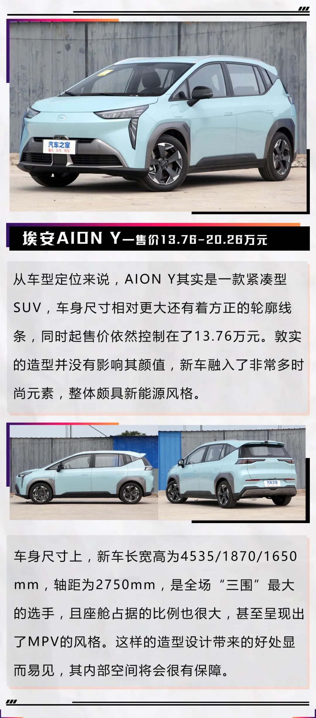 悬架配置上,新车采用前麦弗逊式独立悬架/后扭力梁式非独立悬架;大空间依然是AION Y相比本场其它车型的最大亮点,同时4535mm的车长也足够保障城市穿梭的灵活性。