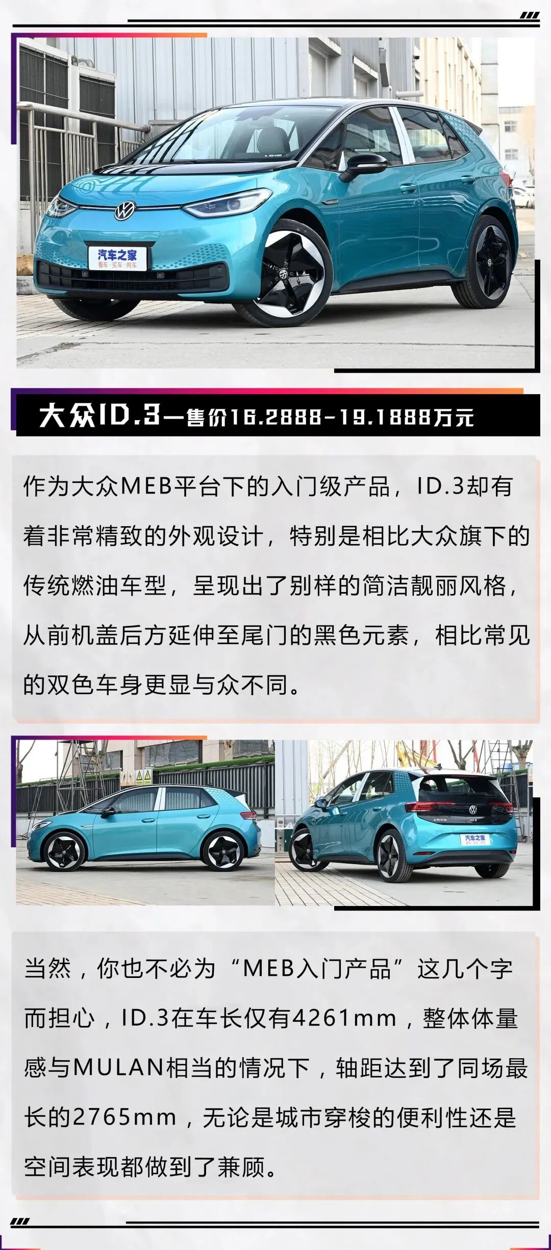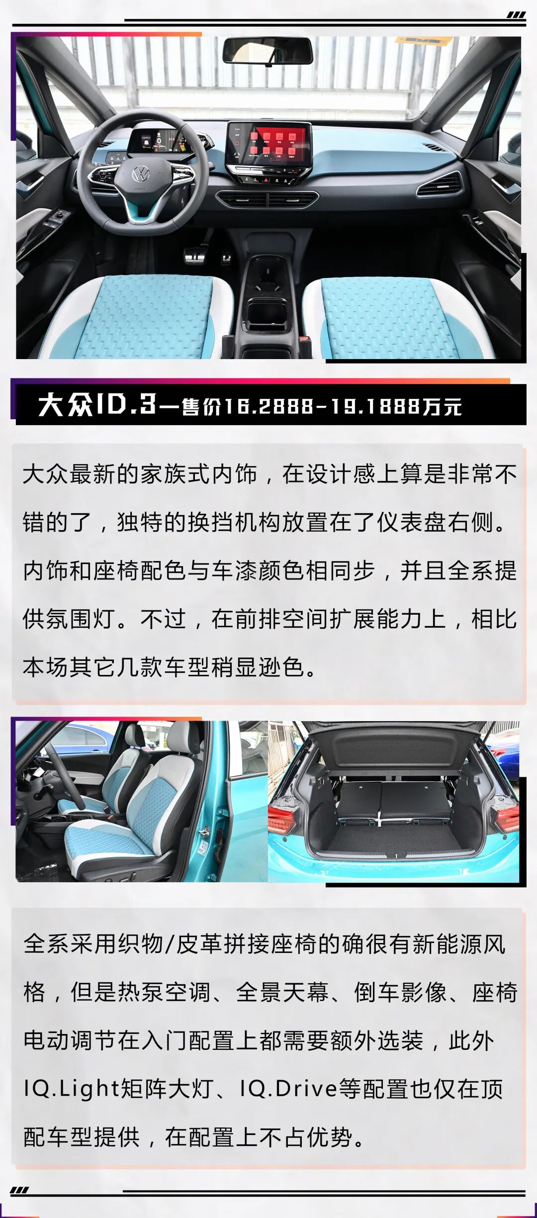 相比上面三款中国品牌车型,ID.3依然保持着大众MEB平台的优势,短车身+长轴距非常有利于城市穿梭,并且可以保证乘坐空间。不过,整体来看ID.3的基础配置并不算丰富,16.2888万元的入门车型在不少舒适性配置上都需要选配。