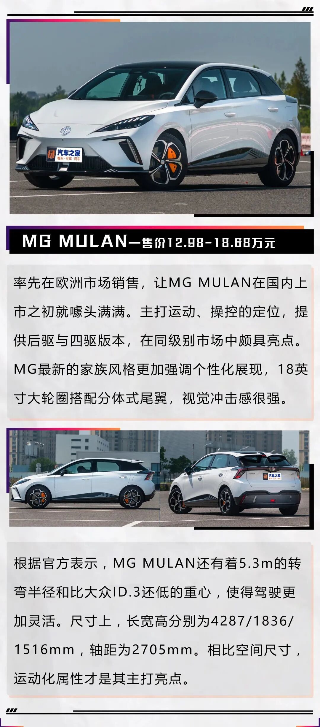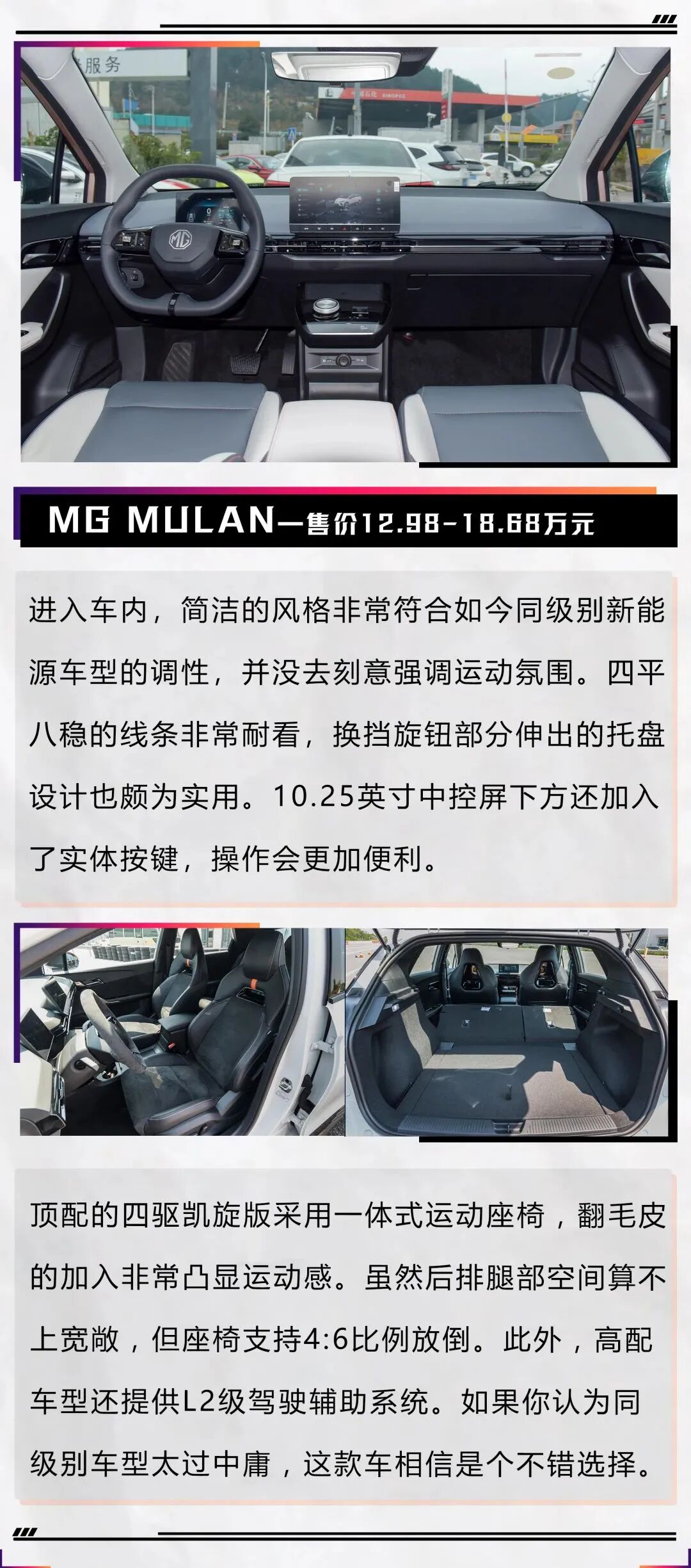 悬架配置上,新车采用前麦弗逊式/后五连杆独立悬架;即使是低功率版本MG MULAN都有着足够出色的动力水平,四驱版更是一台名副其实的小钢炮,加之不错的续航里程,谁说城市代步就不能激情一下了?