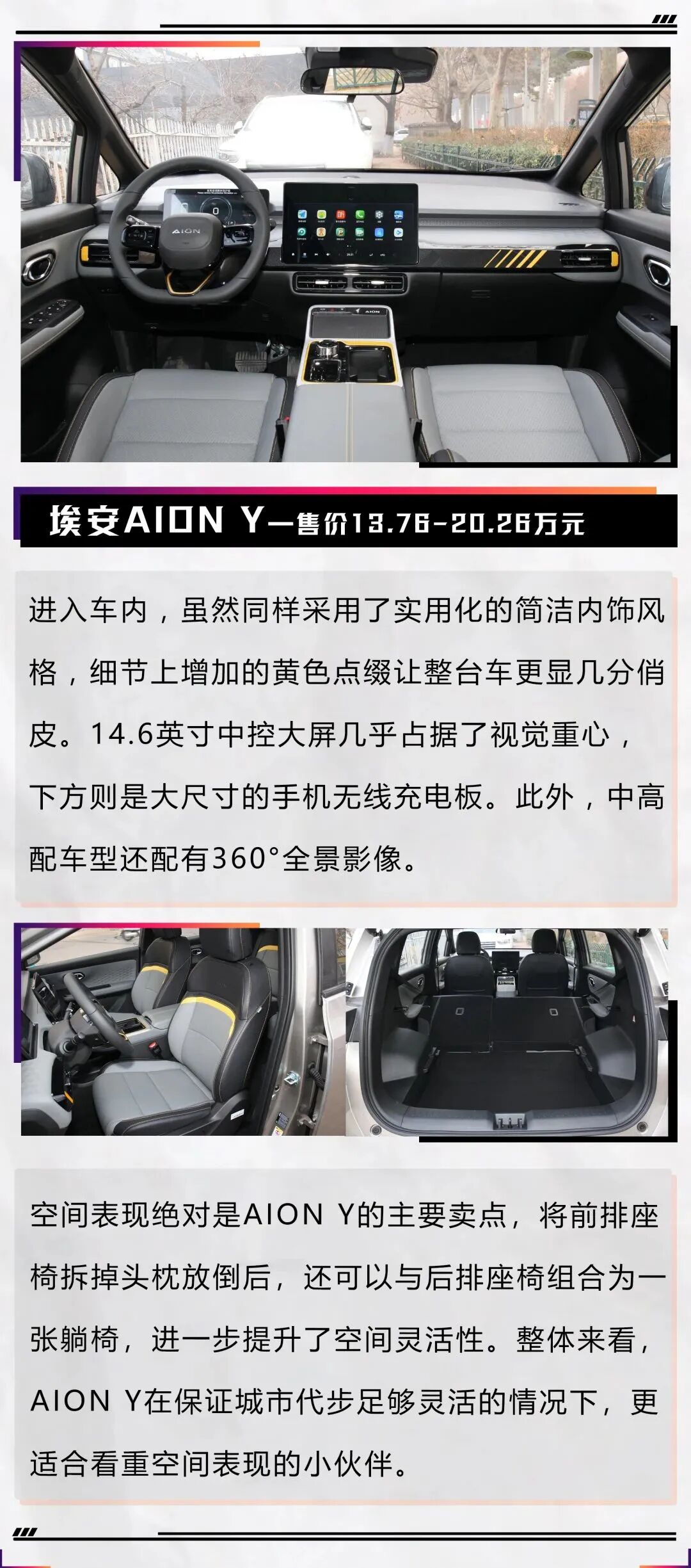 动力上,AION Y目前2022款与2023款均为在售车型,其中,2022款最大功率184Ps,最大扭矩225N·m,NEDC续航里程根据版本不同,分别为500km与600km;2023款最大功率204Ps,最大扭矩225N·m,CLTC续航里程根据版本不同,分别为510km与610km。