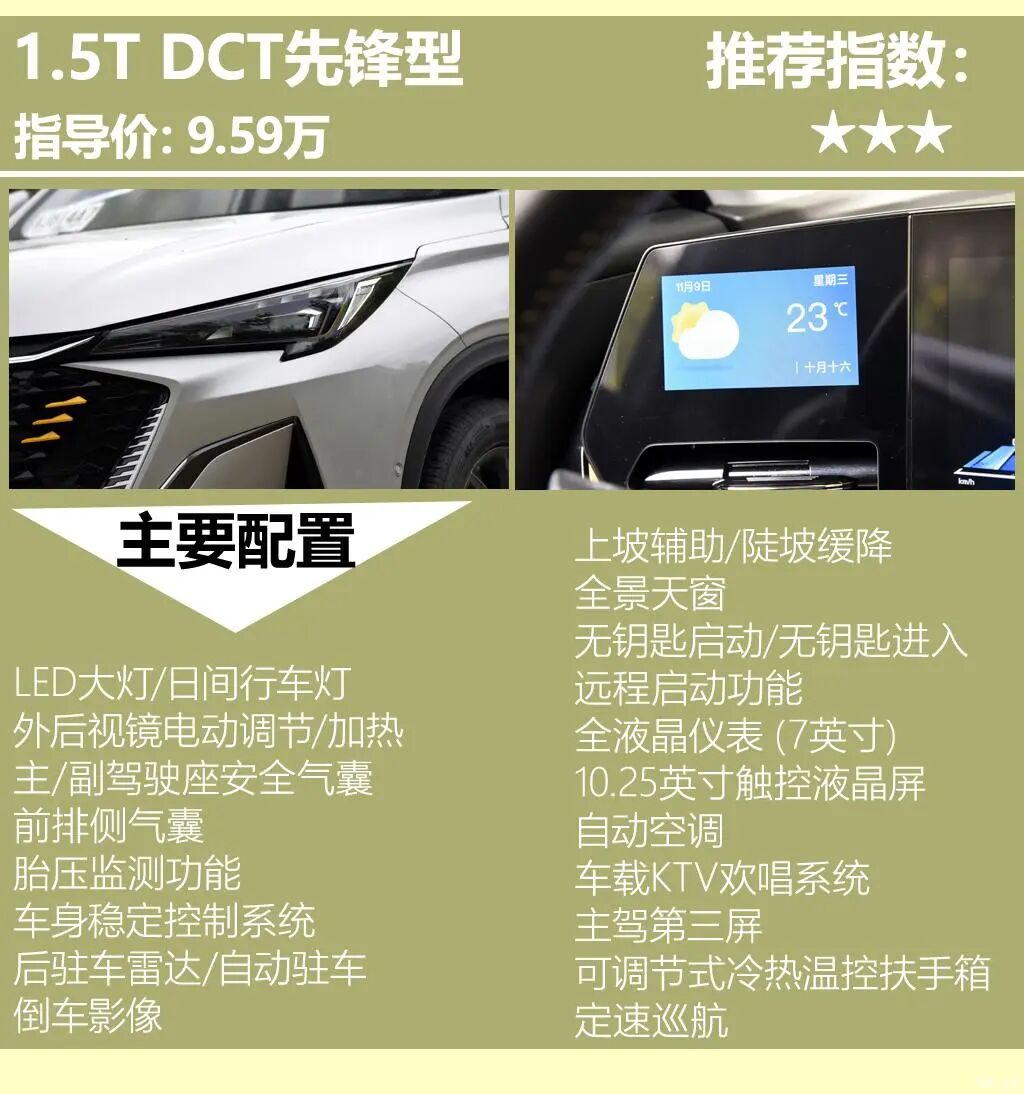 作为入门版,1.5T DCT先锋型售价为9.59万元。从外观来看,它与中高配车型并没有明显的区别,LED大灯、18英寸轮圈以及全景天窗等它都有配备。主被动安全配置方面,基本的主/副驾驶座安全气囊、前排侧气囊、胎压监测以及车身控制系统都到位,另外,全液晶仪表、10.25英寸触控液晶屏和主驾第三屏同样不会让人觉得这是一款低配车型。加上全系动力一样,所以如果预算有限,低配就可以考虑上了。
