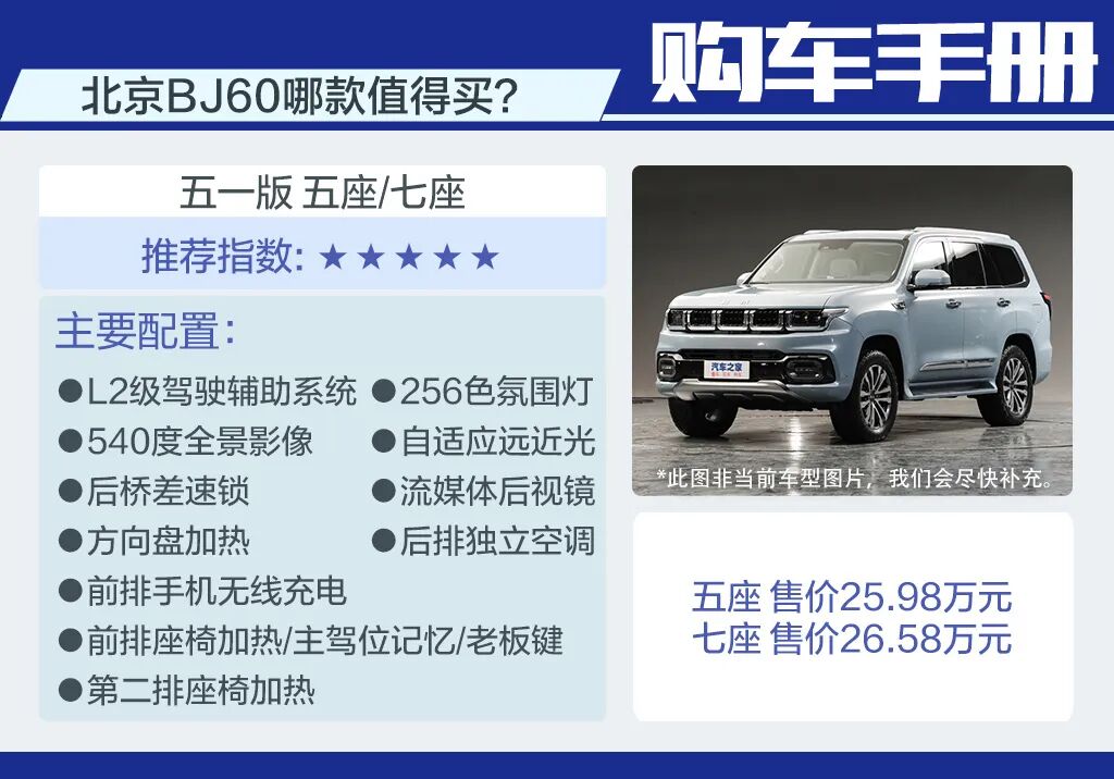 五一版是BJ60最推荐的配置,五座车型相比周末版要贵2万元,但L2级驾驶辅助、540度全景影像、流媒体后视镜、256色氛围灯、后排独立空调与前排/二排座椅加热应有尽有,可以很大程度提升用车舒适性,值得推荐。