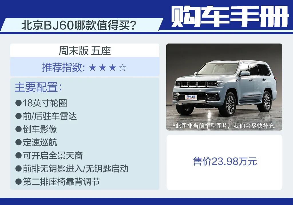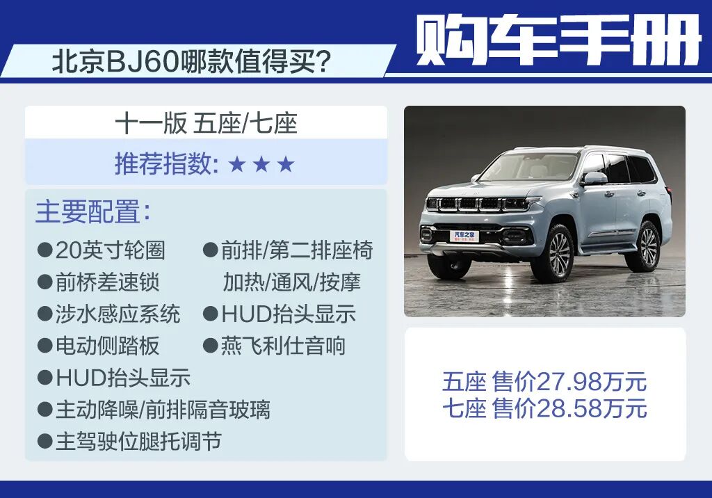 中大型、采用非承载式车身,定位一款豪华硬派SUV,今天的主角便是刚刚完成上市的北京BJ60。新车共计推出5款车型,售价23.98-28.58万元,很巧妙地避开了同级坦克500的价格区间。那么BJ60哪个配置最值得入手呢?一起来看看吧!