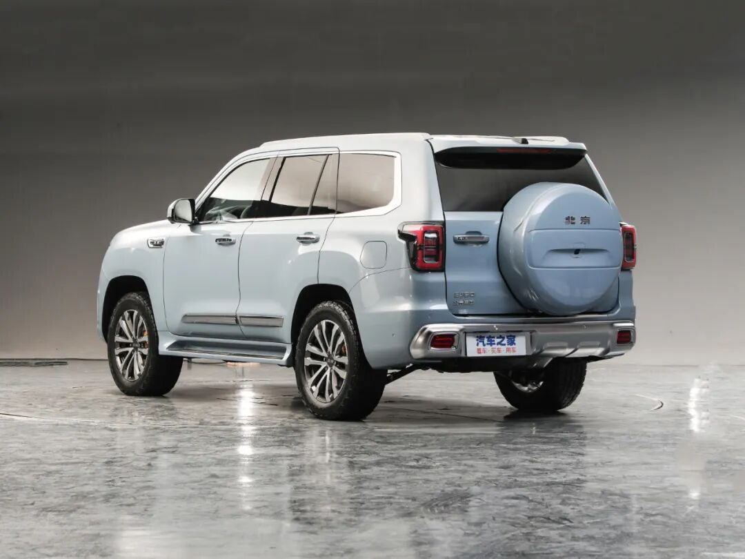 来到车尾,北京BJ60采用了圆角矩形灯线的LED尾灯组,侧开式尾门配备了经典的外挂式备胎,搭配哑光金属质感的后保险杠,对于一款硬派SUV而言这是不会出错的设计。